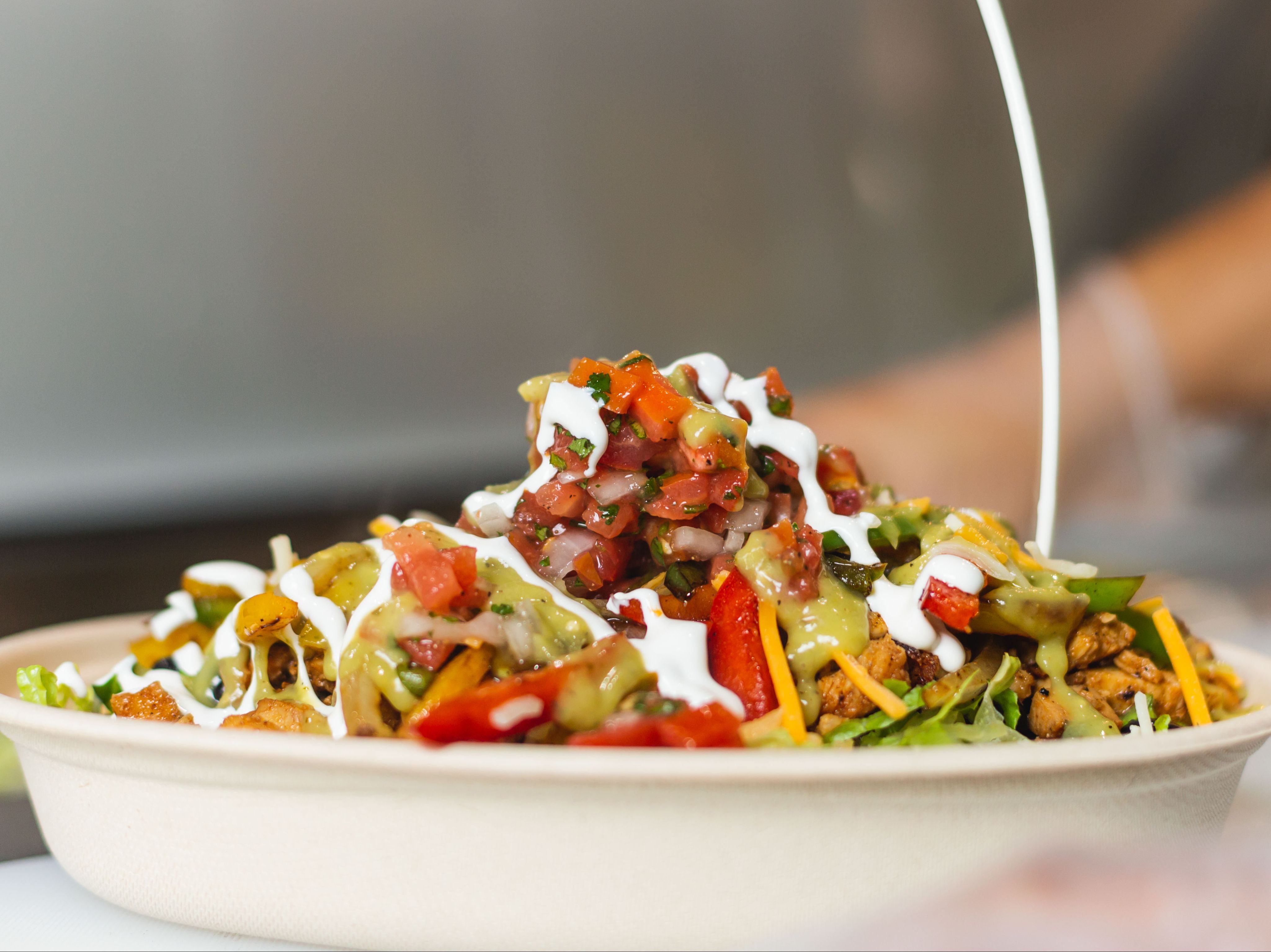10 PERSONS CATERING "BUILD YOUR OWN" BOWL BAR INCLUDES YOUR CHOICE OF TWO PROTEINS (MUSHROOM, CHICKEN, AL PASTOR, CARNITAS, CHORIZO, STEAK, SHRIMP OR FISH) SERVED WITH RICE, BLACK BEANS, CHEESE, LETTUCE, PICO DE GALLO, TOMATILLO SALSA AND CREMA