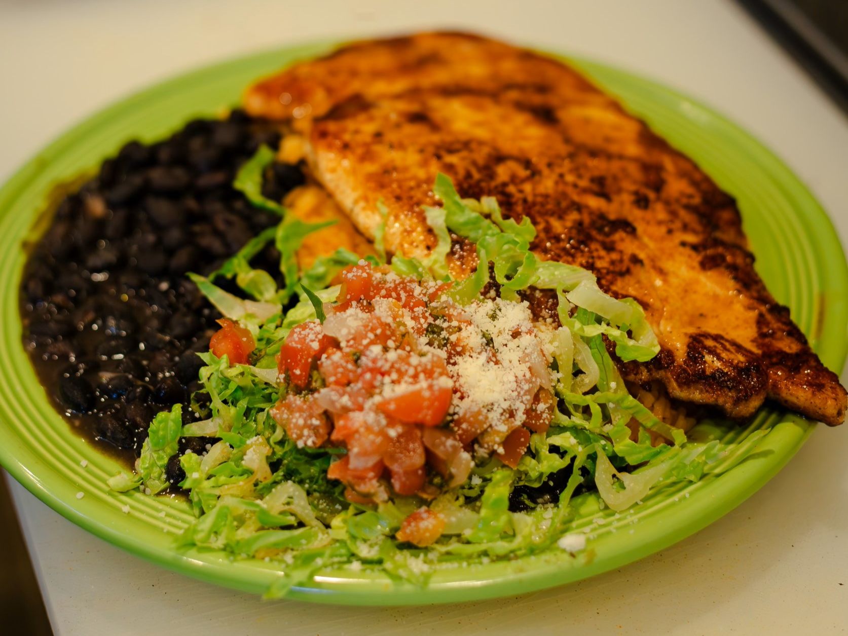 SEASONED & MARINATED CRISPY TILAPIA - Served with rice or lettuce. Topped with black beans, cheese, pico, tomatillo salsa, & crema